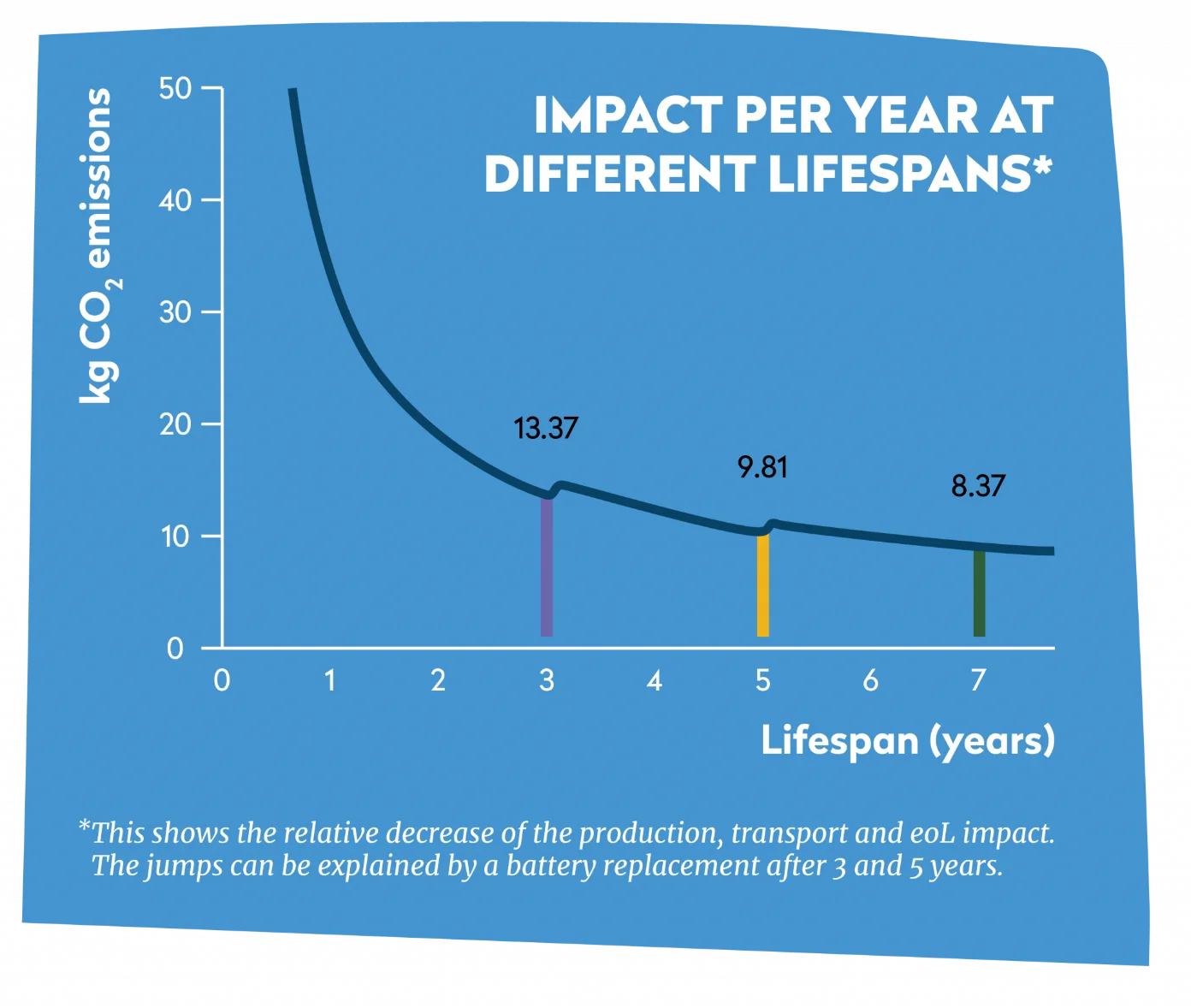 In the case of the Fairphone 3, we are talking about at least five years, which is about double the average market lifespan of smartphones. This is enabled by the modular architecture of the phone, allowing for module upgrades and easy repair. Thereby, the impact of e.g. a battery replacement can easily be compensated by a longer lifespan (see graph). The product system entails a phone and module take-back program which provides reusable or refurbished parts for repairs, goods to the secondary market or input for recycling.