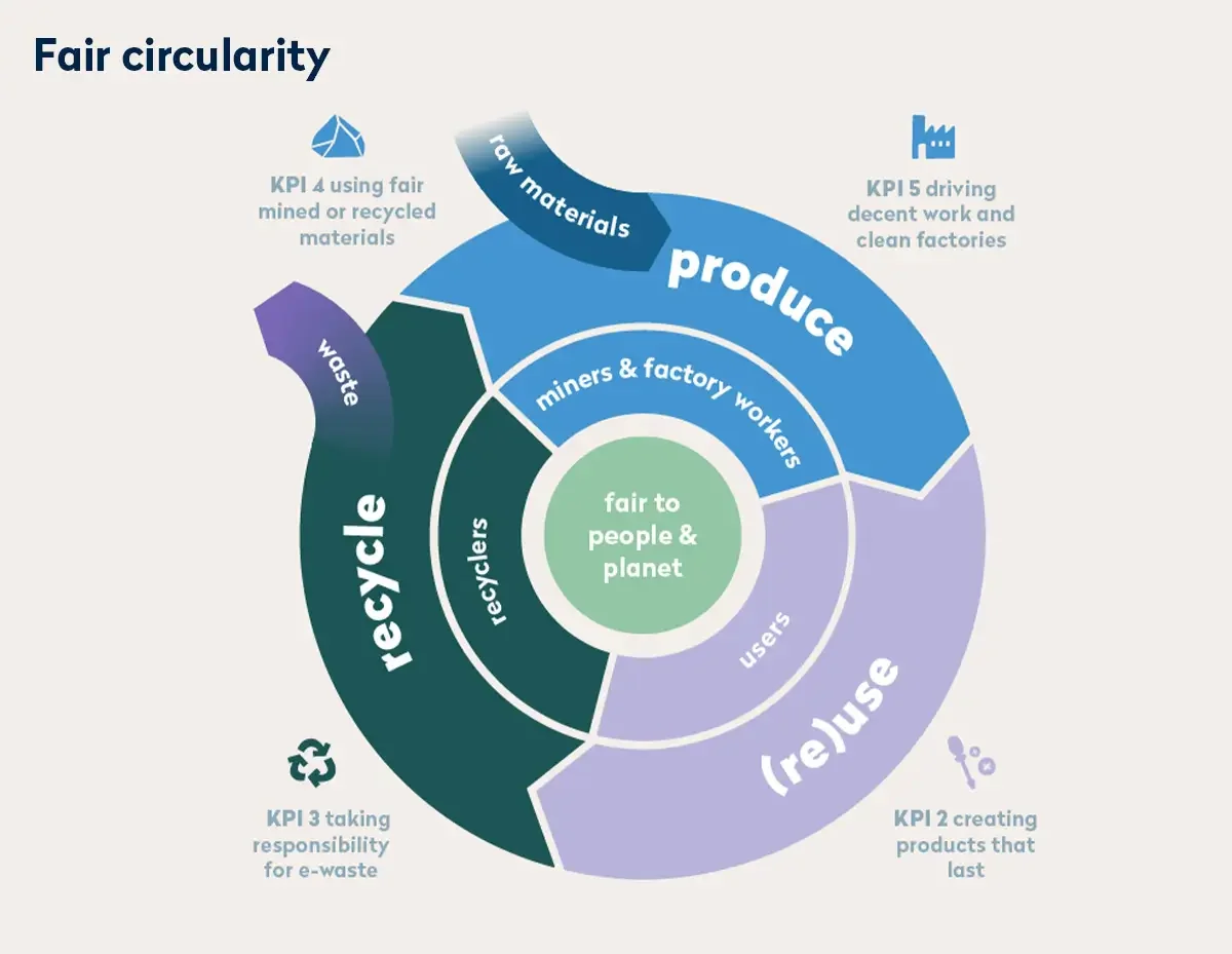 We want a fair transition to an inclusive circular economy. We call it: Fair Circularity. This means being accountable for our material footprint and caring for people and planet in the entire product life cycle, across all levels of circularity. First and foremost, we focus on reducing demand for raw materials – and changing the electronics business model to design for longevity, repair, reuse and recycling.